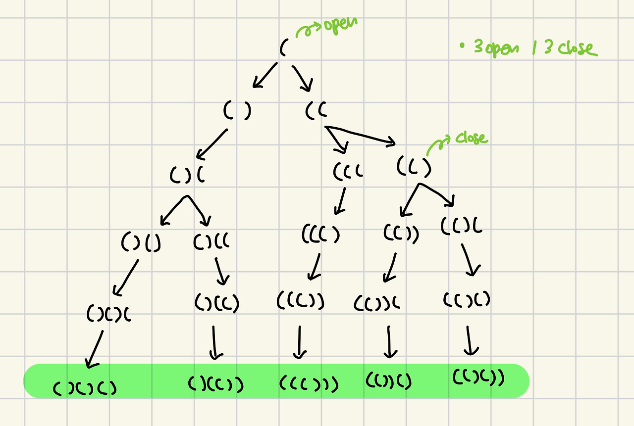 backtracking(open + 1, close, cur + '(')